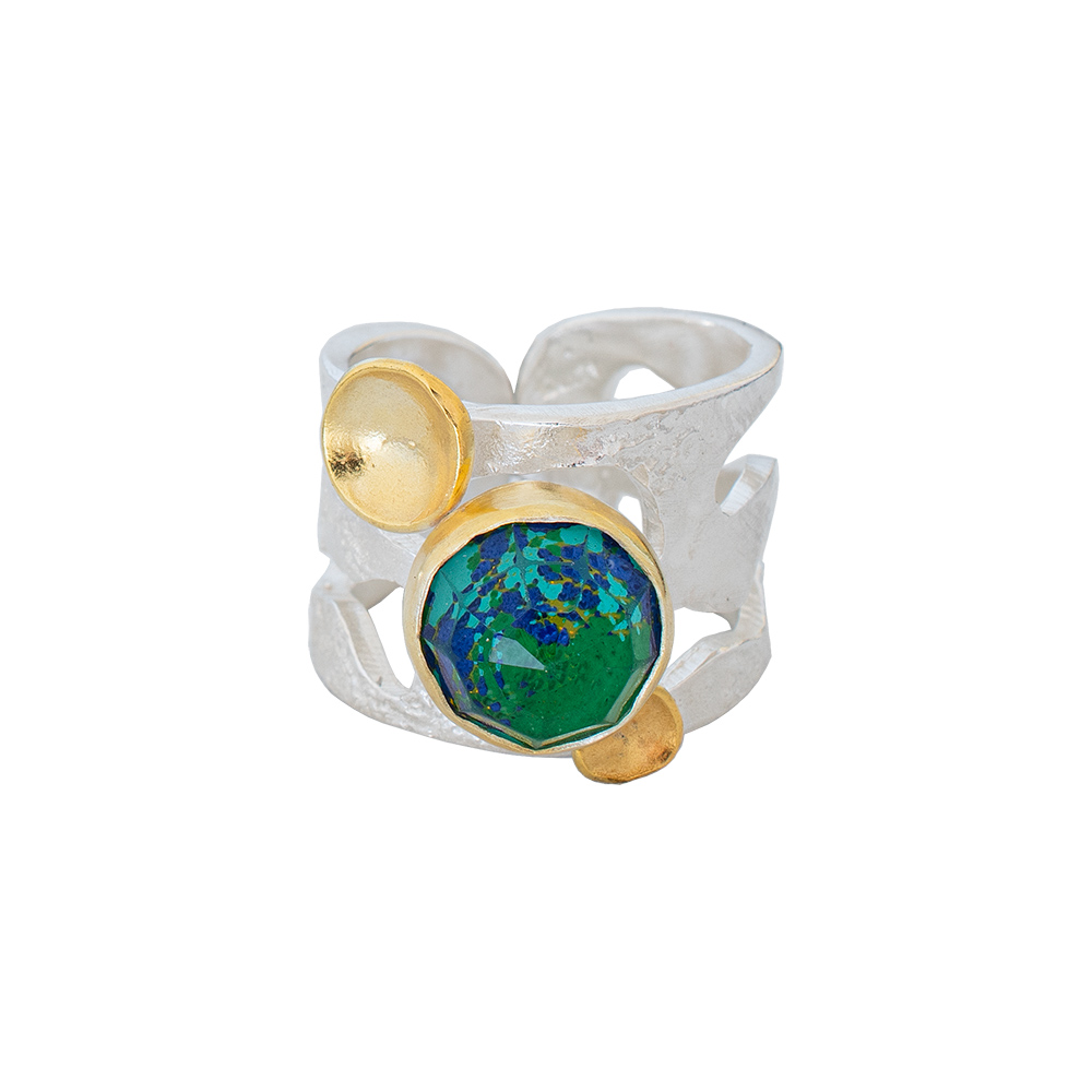 This ring features a unique design with gold plated disks adorned with sparkling semiprecious stones. The combination of the warm gold tone and the colorful stones creates a stunning visual effect.