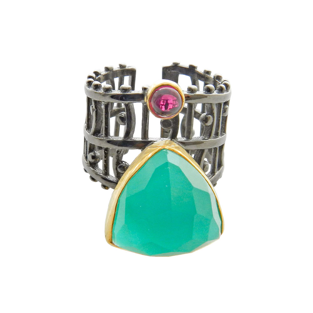 gold and black rhodium plated silver ring with faceted doublet green blue chalcedony and round cabochon garnet