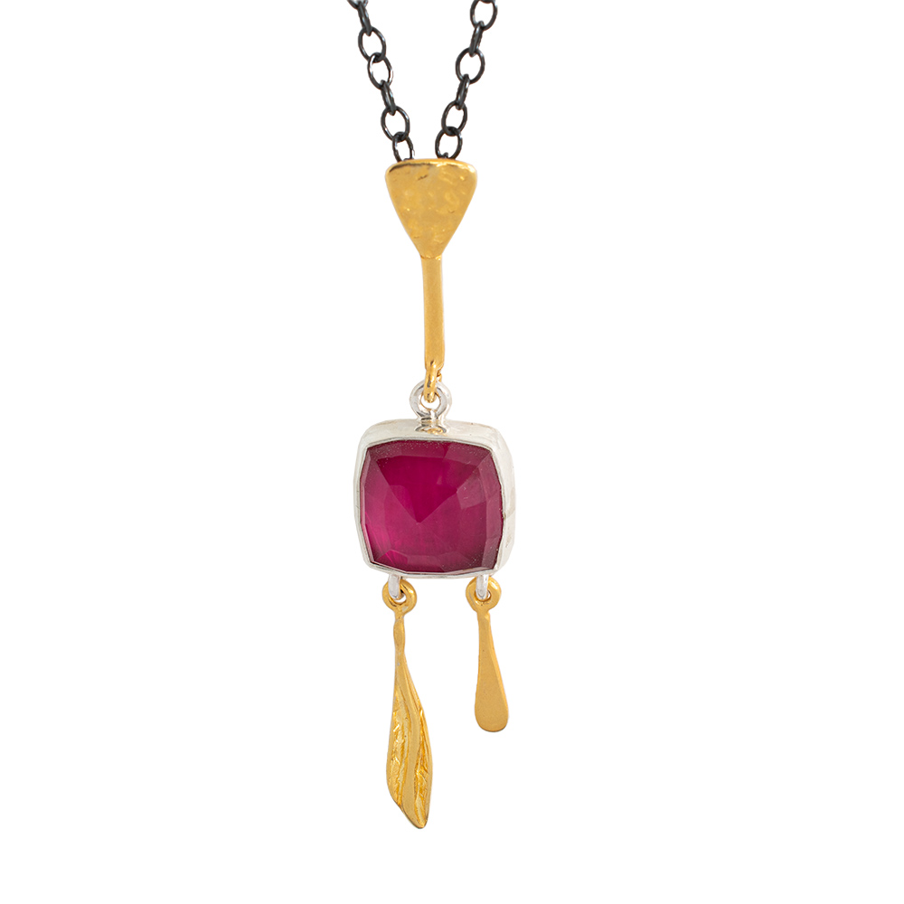 Gold plated silver pendant with faceted crystal quartz and red jade