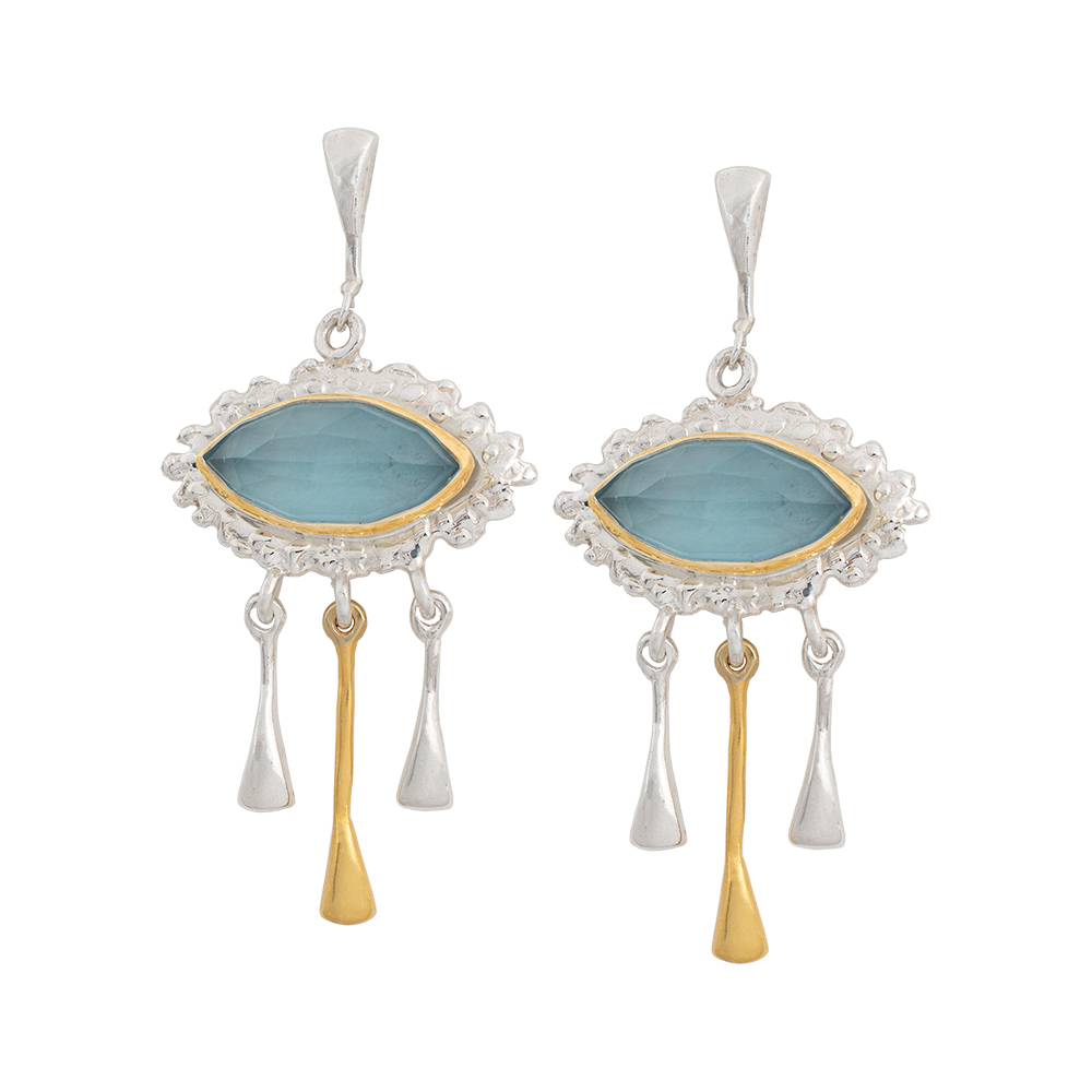 επιχρυσωμένα σκουλαρίκια σε ασήμι με ταγιέ πέτρα ντουμπλέτα μπλε χαλκηδόνιο με χαλαζία