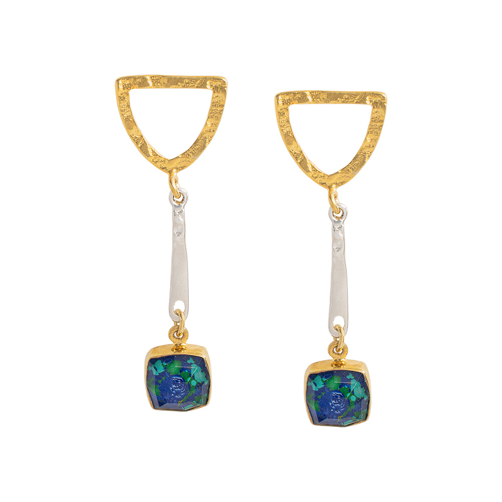 επιχρυσωμένα σκουλαρίκια από ασήμι με ταγιέ πέτρα ντουμπλέτα χαλαζία και αζουρίτη-μαλαχίτη