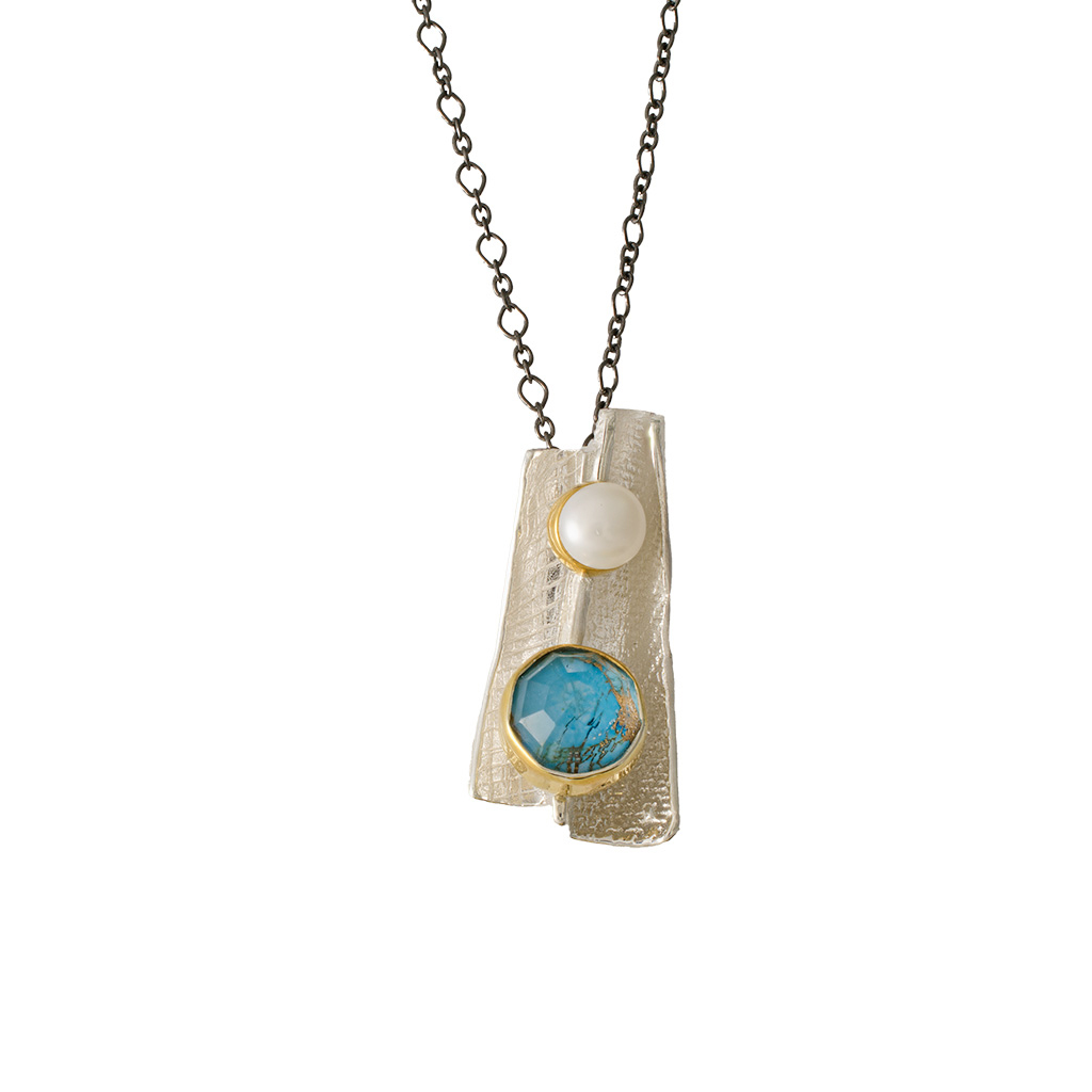 επιχρυσωμένο μοτίφ από ασήμι με λευκό μαργαριτάρι και πέτρα ντουμπλέτα χαλαζία με τυρκουάζ