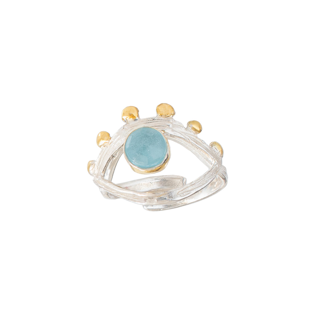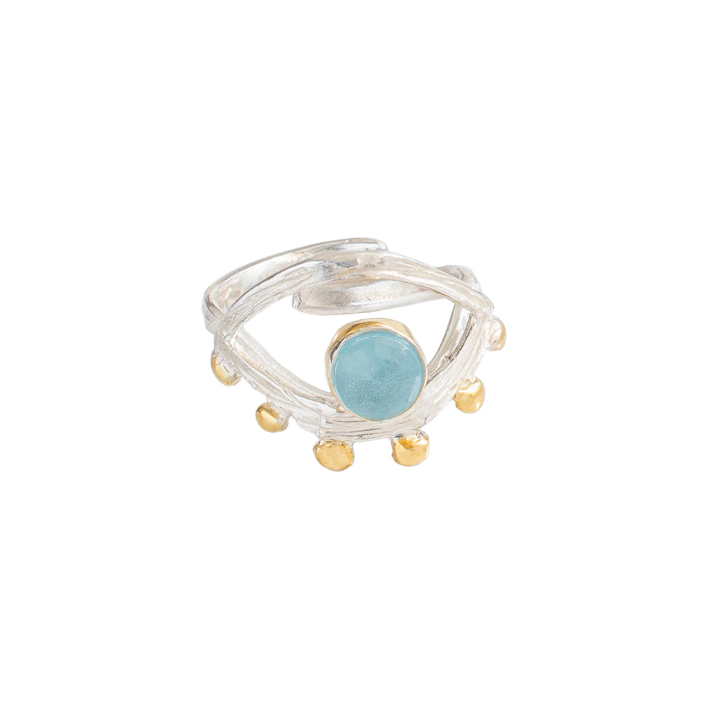 επιχρυσωμένο δαχτυλίδι από ασήμι με ταγιέ ντουμπλέτα κρύσταλλο και μπλε χαλκηδόνιο
