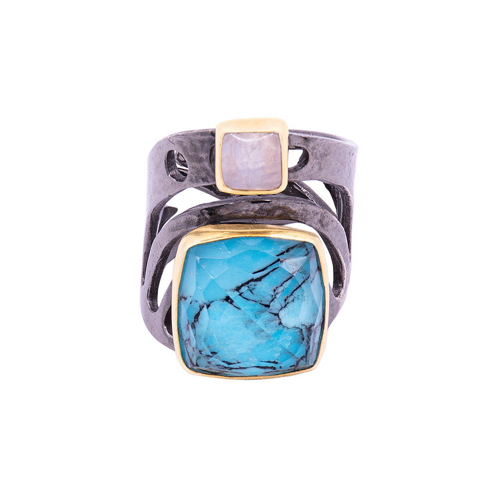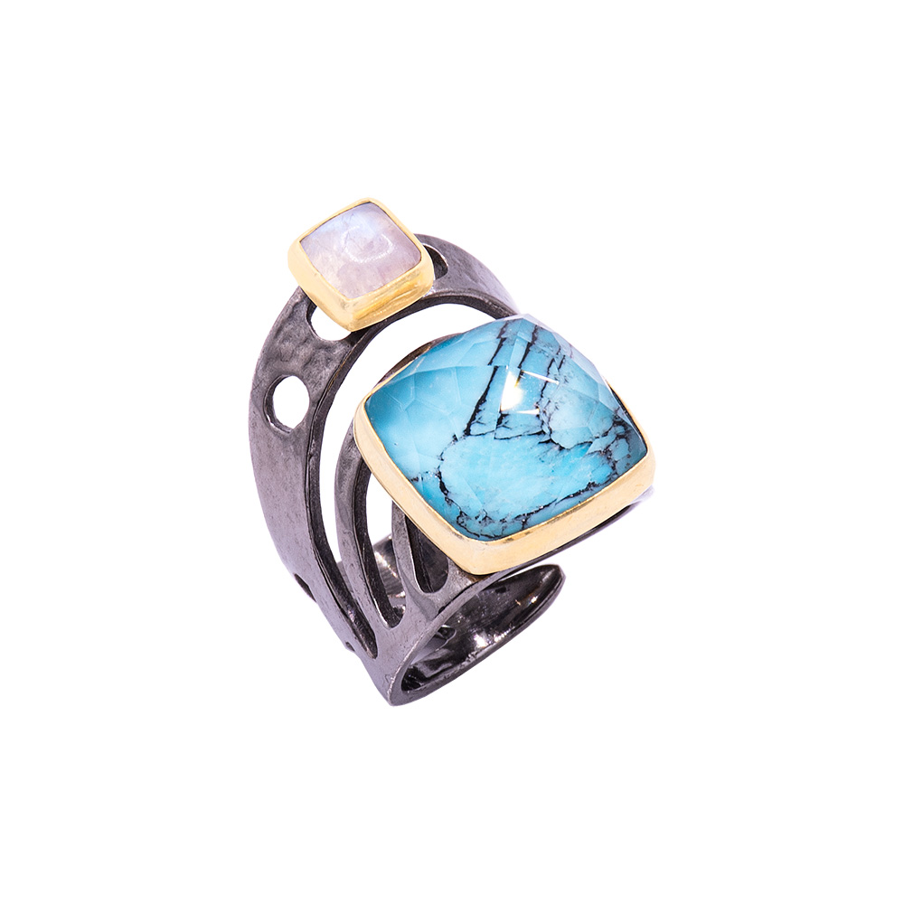 επιροδιωμένο και επιχρυσωμένο δαχτυλίδι από ασήμι με ταγιέ ντουμπλέτα κρύσταλλο και τυρκουάζ και καμπουσόν φεγγαρόπετρα