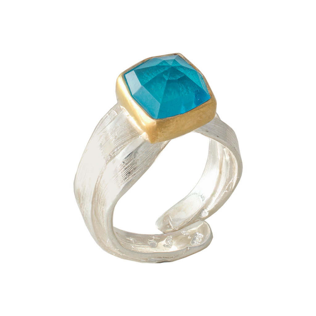 δαχτυλίδι από επιχρυσωμένο ασήμι με ταγιέ ντουμπλέτα πέτρα χαλαζία με μπλε τοπάζι