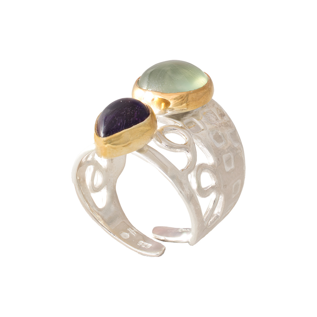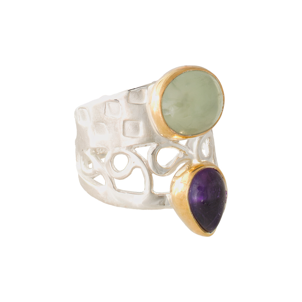 επιχρυσωμένο ασημένιο δαχτυλίδι με καμποσόν πέτρες αμέθυστο και πρενίτη