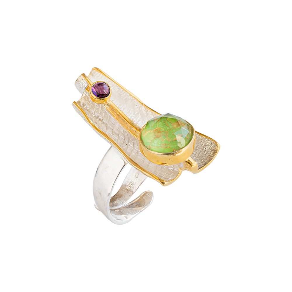 επιχρυσωμένο δαχτυλίδι από ασήμι με ταγιέ ντουμπλέτα κρύσταλλο με πράσινο copper τυρκουάζ και αμέθυστο