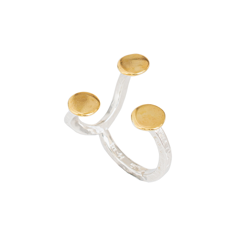 Αυτό το δαχτυλίδι από ασήμι και χρυσό, με τις χαριτωμένες καμπύλες του και τη λεπτή υφή του, ακτινοβολεί διαχρονική κομψότητα και μοντέρνα θηλυκότητα - ιδανικό για εσάς!
