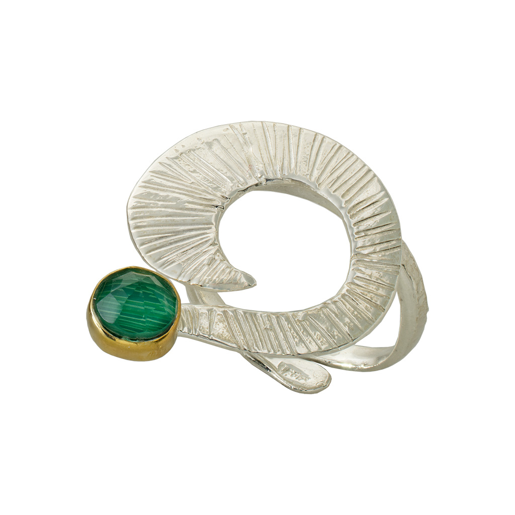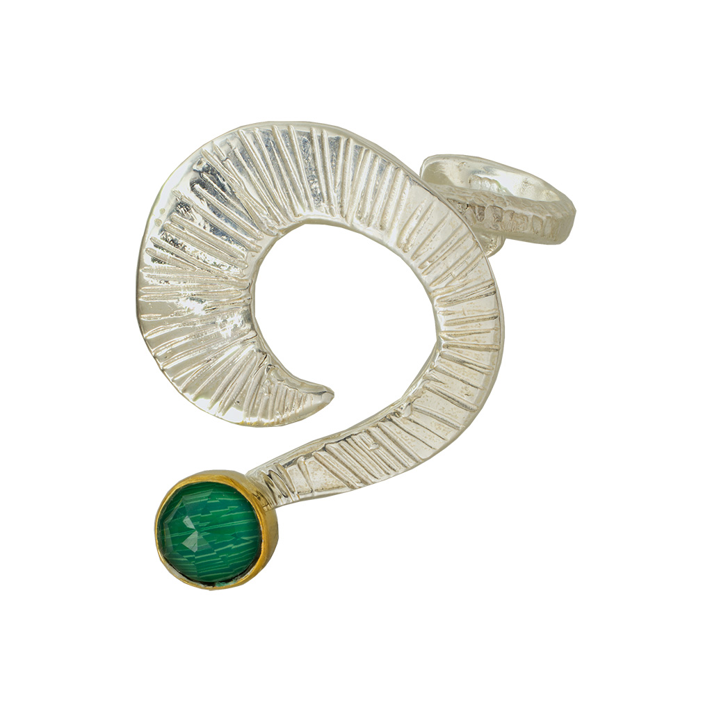 Ποια είναι η ερώτηση; Ένα κόσμημα που θυμίζει στυλιζαρισμένο ερωτηματικό ή αρχαίο σύμβολο. Η ανάγλυφη υφή οδηγεί σε μια πράσινη "έκπληξη" που δίνει χρώμα στην κάθε μέρα