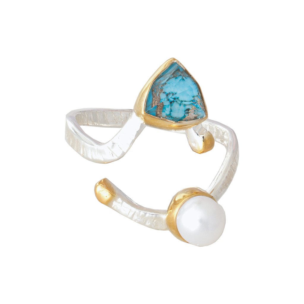 επιχρυσωμένο δαχτυλίδι από ασήμι με πέτρες ταγιέ τυρκουάζ με κρύσταλλο και λευκό μαργαριτάρι
