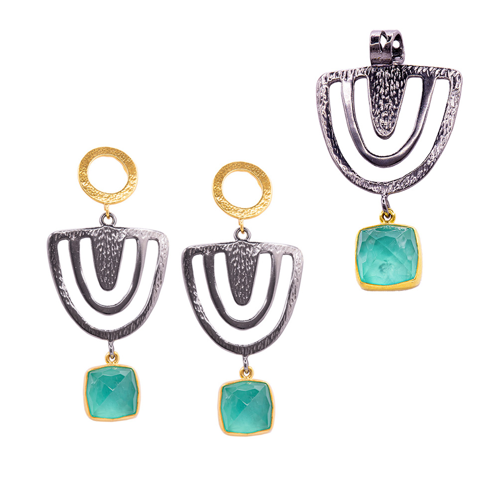 επιροδιωμένα και επιχρυσωμένα κοσμήματα από ασήμι με ταγιέ ντουμπλέτα κρύσταλλο και πράσινο νεφρίτη